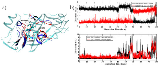 (a) Key residues interacting with NBD-557. Notice the movement of structural motifs surrounding ligand indicated by arrows (blue represents initial, white shows mid and red shows the orientations at the last step of MD simulations. (b) The distance vs. simulation time for 100 ns of MD simulation for key H-bonds (top) and the distance between Glu370 and Asn425 (bottom). Note a constant and strong interaction of NBD-557 with Asn425. Note that all results are reported for the most populated trajectories of 100 ns.