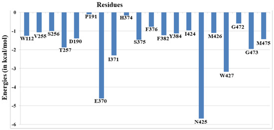 To further emphasize the gp120–ligand interactions, we calculated the residue interaction map, as shown in Figure 4. The residue interaction map calculated by MMGBSA is very informative as non-polar and hydrophobic interactions cannot be analyzed in a similar manner to H-bond and salt-bridges. We can see that Glu370 and Asn425 interact strongly with NBD-557 due to the H bond, as shown in Figure 4. The ligand is mostly in contact with several hydrophobic residues such as Trp112, Val255, Ile371, Phe376, Phe382, Ile424, Met426, Gly472, Gly473 and Met475. These hydrophobic and non-polar residues contribute significantly to the total favourable change of enthalpy during binding. Interestingly, similar interactions were predicted in the crystal structure of NBD-557 with gp120 [20]; therefore, the calculated residue interactions map provides a theoretical validation and shows the stability of such interactions during 100ns of MD simulations.