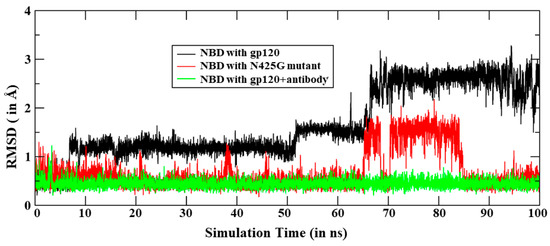 The RMS deviations for NBD-557 in all three MD simulations, i.e., with gp120, in Asn425Gly mutant and with antibody. Note that all results are reported for the most populated trajectories of 100 ns.
