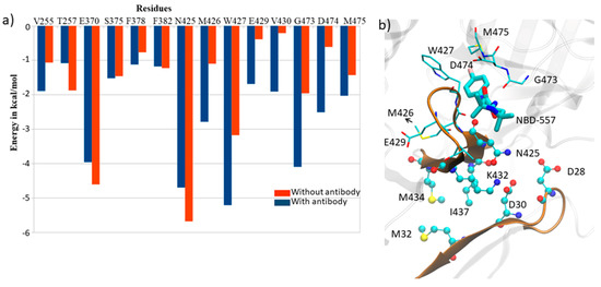 The results shown above provide compelling evidence that the presence of antibody in gp120 stabilizes the complex via acid–base pair interactions at the binding interface; however, whether the antibody affects the drug binding is still unknown. Therefore, we calculated the change in enthalpy upon ligand binding in the presence and absence of antibody (See Table 1 for NBD-557 binding enthalpy in the absence of antibody). Our calculations, shown in Table 4, show that the presence of antibody not only stabilizes the gp120 complex via acid–base pair interactions, but also increases the binding of ligand. We can see that, in the absence of antibody, the change in enthalpy due to ligand binding is −25.16 kcal/mol, while, in the presence of antibody, it significantly increases to −33.57 kcal/mol. To investigate the rationale for the increased affinity, we thoroughly monitored the MD trajectories and the residues of gp120 participating in ligand binding and antibody-gp120 binding. Figure 8a shows a comparative interaction map due to antibody binding. It is quite clear that the binding of antibody increases the interactions with NBD for some residues, e.g., Met436, Trp427, Val430, Gly473, Asp474, which provide stability to the binding of NBD-557. As Figure 8b shows, these residues reside on the bridging sheet 20 (see Figure 1b and Ref. [11] for structural topology), which is an interfacial loop interacting with the antibody; therefore, these residues show conformational rearrangement, which might cause increased interactions with NBD on antibody binding.
