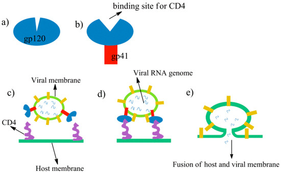 A schematic representation of HIV-1 entry and fusion of virion into the host membrane. (a) a schematic representation gp120, (b) a schematic representation of gp41 binding with CD4 and (c–e) attachment and fusion of virus with host membrane