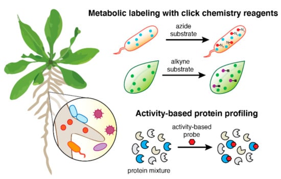 Click chemistry reagents and activity-based probes as chemical tools for studying plant-microbe interactions. Metabolic labeling of live microbes and plant tissues with azide- or alkyne-modified glycan, monolignol, lipid, or amino acid substrates enables click chemistry attachment of various tags for imaging or affinity enrichment. Activity-based probes label enzymes based on their specific mechanisms of action, allowing for functional characterization of proteins even in complex, poorly annotated biological samples.