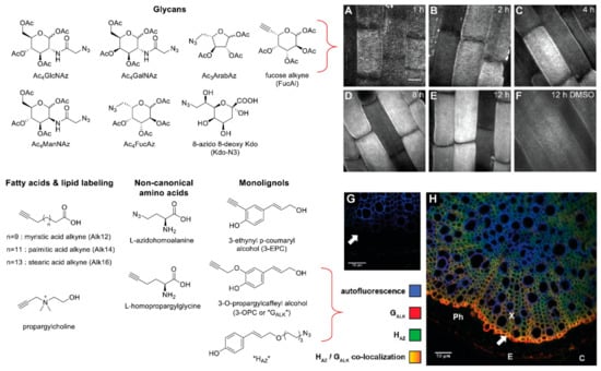 Structures and applications of selected azido and alkynyl reagents for metabolic labeling of plants and microbes. (A–E) Four-day-old Arabidopsis seedlings were treated with 2.5 μM FucAl for the indicated times, labeled with Alexa 488-azide, and z series of elongation-zone root epidermal cells were recorded using a spinning disk confocal microscope with a 1.4 NA 100× oil-immersion objective. Images are contrast enhanced maximum projections of the z series. (F) Control seedlings treated with DMSO for 12 h and labeled with Alexa 488-azide show background fluorescence. (Scale bars, 10 μm) []. (G,H) Bioorthogonal Labeling Imaging Sequential Strategy (BLISS) illustrating incorporation of monolignol chemical reporters “GALK” and “HAZ” into cell walls in 2-month-old flax roots. Sectioned flax roots previously incubated with native p-coumaryl and coniferyl alcohols as negative control (G) or with azide-labeled p-coumaryl alcohol (HAZ) and alkyne-labeled coniferyl alcohol (GALK) monolignol reporters (H) and observed by confocal microscopy []. Images and portions of the caption reprinted (adapted) from Anderson, C.T.; Wallace, I.S.; Somerville; C.R. Proc. Natl. Acad. Sci. USA 2012, 109, 1329–1334 under the PNAS License to Publish, and from Simon, C.; Lion, C.; Huss, B.; Blervacq, A.S.; Spriet, C.; Guérardel, Y.; Biot, C.; Hawkins, S. Plant Signal. Behav. 2017, 12, e1359366 under the terms of the Creative Commons Attribution-NonCommercial-NoDerivatives License (http://creativecommons.org/licenses/by-nc-nd/4.0/).