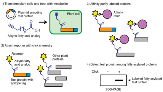 Schematic of metabolic labeling using alkyne fatty acid analogs for the capture and enrichment of fatty acylated proteins for investigating molecular mechanisms of plant immunity and pathogen virulence. Boyle et al. demonstrated this approach in Arabidopsis protoplasts and stable transgenic Arabidopsis plants using well-studied proteins FLS2, AvrPto, and Pto, which are involved in plant–pathogen interactions []. Image and caption reprinted (adapted) from Boyle, P.C.; Schwizer, S.; Hind, S.R.; Kraus, C.M.; De la Torre Diaz, S.; He, B.; Martin, G.B. Plant Methods 2016, 12, 38 (DOI: 10.1186/s13007-016-0138-2) under the terms of the Creative Commons Attribution 4.0 International License (http://creativecommons.org/licenses/by/4.0/).