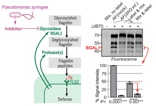 Secreted β-galactosidase BGAL1 and proteases contribute to plant host immunity against bacteria with glycosylated flagellin. Secretion of a BGAL1 inhibitor by pathogenic P. syringae suppresses host defense response. BGAL1 labeling is suppressed in apoplastic fluid (AF) of infected plants at 2 days postinfection (dpi). The two samples were also mixed in a 1:1 ratio before (mix and label) and after (label and mix) labeling with JJB70. The quantified fluorescence of the BGAL1 signal is plotted below. Error bars indicate mean ± SE of n = 3 replicates; t test was used to determine P values []; *** and ** indicate p values < 0.001 and 0.01, respectively. Image and caption adapted from Buscaill, P.; Chandrasekar, B.; Sanguankiattichai, N.; Kourelis, J.; Kaschani, F.; Thomas, E.L.; Morimoto, K.; Kaiser, M.; Preston, G.M.; Ichinose, Y.; van der Hoorn, R.A.L. Science 2019, 364, 6436 (DOI: 10.1126/science.aav0748). Copyright 2019 American Association for the Advancement of Science.