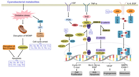 Cyanobacteria (blue-green microalgae) are ubiquitous Gram-negative photoautotrophic prokaryotes, for which evidence they existed 3.3–3.5 billion years ago was found [1]. They exist in the environment as unicellular, filamentous or colonial forms surrounded by a mucilaginous sheath [2]. Owing to their ubiquitous nature and the vast diversity of their metabolites, they have several applications in the biomedical field. During the last few decades, the emergence of new cancers and their developing resistance to available drugs has led to chemotherapeutic failure. Thus, the identification of new biologically active compounds is immediately required for the development of new drugs. In this regard, the medicinal properties of cyanobacteria have been explored. To date, several secondary metabolites have been isolated from the members of oscillatoriales (49%), followed by nostocales (26%), chroococcales (16%), pleurocapsales (6%) and stigonematales (4%) [2,3]. The capacity of cyanobacteria to integrate non-ribosomal peptide synthetases with polyketide synthases enables them to produce biologically active and chemically diverse compounds, such as cyclic alkaloids, peptides, depsipeptides, cyclic depsipeptides, fatty acid, lipopeptides, swinholides and saccharides [4]. Back in 1500 BC, Nostoc sp. was first used to treat gout, fistula and different types of cancers [5]. However, more focused research utilizing modern technologies was started in this field in the 1990s. Several cyanobacteria species are cultivated in commercial platforms to extract bioactive compounds, which have been shown to possess anticancer activity and potentially kill a variety of cancer cells via the induction of apoptosis or altering the activation of cell signaling [4,6] (Figure 1).