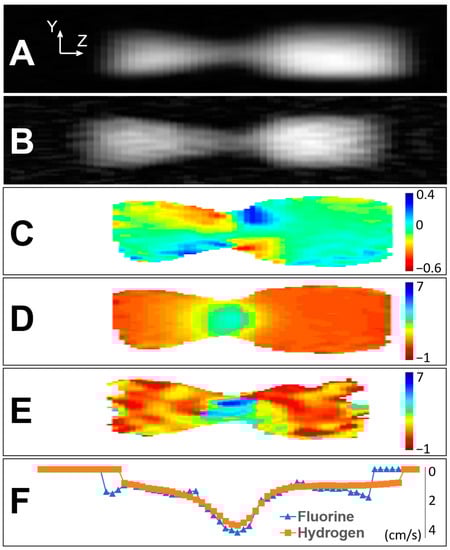 Figure 1C is the map of the Y-component of velocity for the hydrogen signal, and it shows expected results. The foam moved in towards the pipe axis as it flowed into the constriction and the pipe diameter decreased. The foam moved away from the pipe axis as the pipe diameter increased past the narrowest point. Figure 1D is the map of the Z-component of velocity (i.e., along the pipe axis) for the hydrogen signal. The results were as expected. The flow speed along the pipe axis increased as the diameter of the pipe decreased in the constriction. The flow speed decreased as the diameter increased past the narrowest point, and a jet was present. Figure 1E is the map of the Z-component of velocity for the fluorine signal. The expected behavior of higher speeds being present at the narrowest point in the pipe was apparent, although the results were less clear than the hydrogen velocity map due to the poor signal-to-noise ratio (SNR) of the fluorine signal. Figure 1F shows velocity profiles of the Z-component for hydrogen and fluorine signal taken along the pipe axis, averaged across the width of the pipe. Although the uncertainty in velocity values for the fluorine signal was high due to the low SNR, the comparison of centerline profiles indicated that the velocities along the pipe axis were comparable with hydrogen.