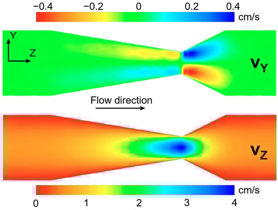 Simulation results of foam flow through the pipe constriction using a Herschel–Bulkley fluid viscosity model, a foam quality of 0.75, and a flow rate of 0.0009 L/s. The bulk flow direction is from left to right. The figure on top shows the results for the Y-component of velocity, and the figure on bottom shows the results for the Z-component of velocity.