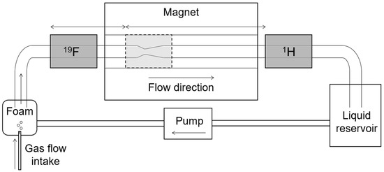 Schematic of the flow apparatus. Foam was created by bubbling C4F8 gas through a liquid solution and flowed through a pipe placed in the magnet. A constriction in the pipe was the region of interest. Fluorine signal (gas phase) was measured by inserting the 19F RF probe and removing the 1H RF probe. Hydrogen signal (liquid phase) was measured by inserting the 1H RF probe and removing the 19F probe. The shuttling of probes was accomplished without interrupting the foam flow.