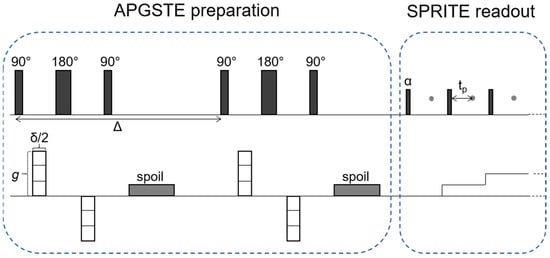 A schematic of the APGSTE-SPRITE pulse sequence [15]. Each individual SPRITE k-space measurement trajectory is preceded by an APGSTE preparation to ensure all measured data are motion sensitized. The parameters shown are as follows: g is the amplitude of the motion-sensitizing PFG, δ/2 is the duration of the PFG, Δ is the flow evolution time, α is the flip angle of the imaging RF pulses in the SPRITE readout, and tp is the phase encoding time (the time between sample excitation and signal detection).
