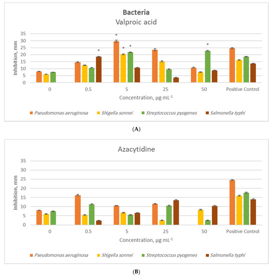Antibacterial activity (zone of inhibition, mean, and SD error bars, n = 3) of the crude extract of the endophytic fungus P. heveicola cultured with different concentrations of the epigenetic modifiers valproic acid (A) and 5-azacytidine (B), where 0 µg/mL refers to the control treatment. The positive control contains ampicillin + tetracycline. * indicates significant difference (t-test, p < 0.05) from the positive control.