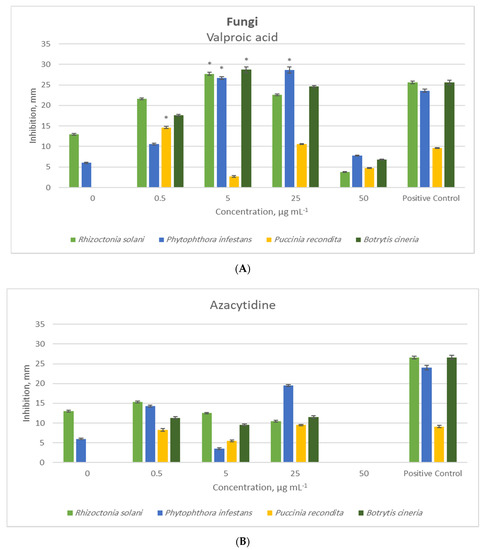 In the t-tests of antifungal activity, 5-azacytidine had no increasing effects on the inhibition zones when compared to the positive controls (Figure 2). The lowest concentration valproic acid treatment (0.5 μg/mL) caused a 21% higher inhibition zone against P. recondite than the positive control. Valproic acid at 5 μg/mL resulted in 8%, 13%, and 12% higher inhibition zones against R. solani, P. infestans, and B. cineria, respectively, compared to the positive controls. Valproic acid at 25 μg/mL resulted in a 21% higher inhibition zone against P. infestans than the positive controls. The highest concentration of valproic acid did not have a significant increasing effect on antifungal activity.