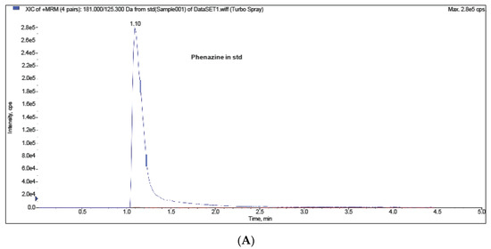MRM/MS analysis was used to detect the antibiotic compound phenazine-1-carboxylic acid (C12H8N) in the extracts. Agilent 6420 Triple Quad LC/MS system with C18-AR column, 3 µm, 50 × 4.6 mm (MAC-MOD Analytical Inc. Part No. EXL1190546U, MAC-MOD Analytical, Chadds Ford, PA, USA) was used with the mobile phase as acetonitrile-water-trifluoroacetic acid (90:10:0.04, v/v/v) at flow rate 1.0 mL/min and wavelength 248 nm and the sample injection volume was 1 μL.
