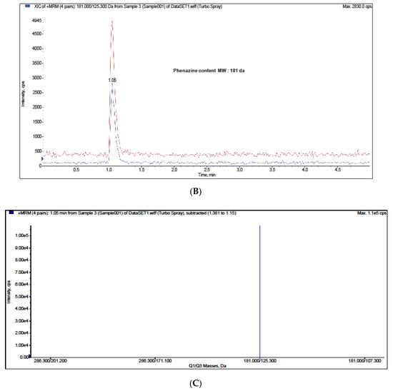 The presence of the antibiotic compound phenazine-1-carboxylic acid was observed with a multiple reaction monitoring mass spectrometry (MRM-MS) system. The standard peak was detected in the retention time of 1.10 min (Figure 3A), which was similar to the valproic acid treatment (1.05 min) (Figure 3B). No other treatments were detected at the peak. The extract from the valproic acid treatment resulted in a mass of 181 kDa (positive mode of ionization), while the mass of phenazine-1-carboxylic acid was 180 kDa (Figure 3C).
