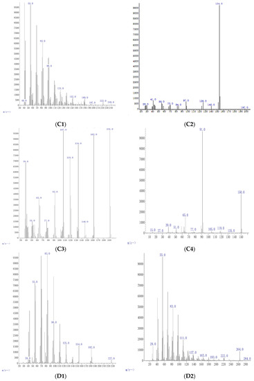 GC-MS/MS mass spectra of the crude extract prepared from the medium of the endophytic fungus P. heveicola cultured with valproic acid as an epigenetic modifier at different concentrations. (A) 0.5 μg/mL cyclopropane. (B) 5 μg/mL: Oxathiazole 2 thione (B1) and pyrrolo[-1,2-a] pyrazine-1,4-dione,hexahydro-3,2-methyl (B2). (C): 25 μg/mL cyclopentadecanone (C1); oxazole (C2), 4-ethyl 4,5-dihydro 2,2-hydroxy phenyl (C3); and benzene acetic acid (C4). (D) 50 μg/mL chloroacetic acid (D1) and cis-vaccenic acid (D2).