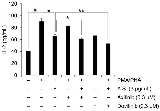 2.3. A.S. Extract Inhibits the PMA/PHA-Mediated NF-κB Signaling Pathway and IL-2 mRNA Expression and Secretion