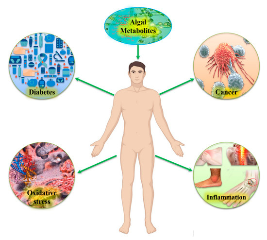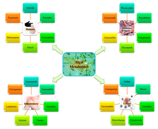 Potential beneficial effects of algal metabolites on human health. Secondary metabolites in marine algae could provide novel drug candidates for fighting various diseases, e.g., by reducing the α-amylase and α-glucosidase activity in diabetes; by reducing inflammation thanks to their antioxidant capacity; and inhibiting cellular proliferation in tumor cells.