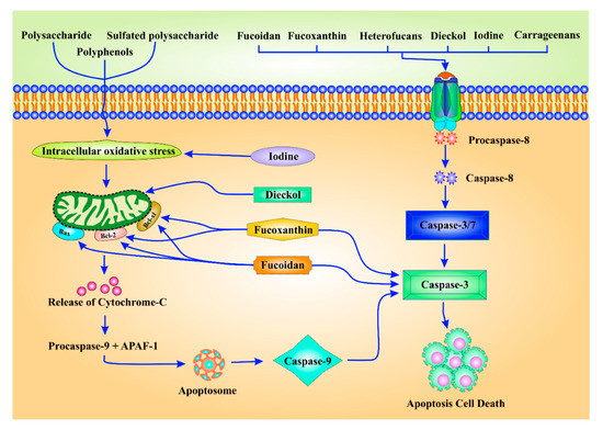 Apoptosis modulation by algal metabolites in cancer prevention. Polysaccharides, sulfated polysaccharides, iodine, dieckol, fucoxanthine, fucoidan, and polyphenols downregulate the expression of anti-apoptotic protein Bcl-xl, Bcl-2. Similarly, they enhance the Bax expression to aid apoptosis. Fucoidan supports the intrinsic apoptosis via regulating the cytosolic release of cytochrome C. Fucoxanthine and fucoidan induces the expression of caspase 9 and caspase 3 to induce apoptotic cell death. Moreover, fucoidan, fucoxanthine, heterofucans, dieckol, iodine, and carrageenans induce apoptosis through modulation of caspase 3 activity via death receptor-mediated apoptotic cell death in several cancer cell lines. In addition to this, they also regulate caspase 8 activity inducing extrinsic apoptosis in different cancer cells.