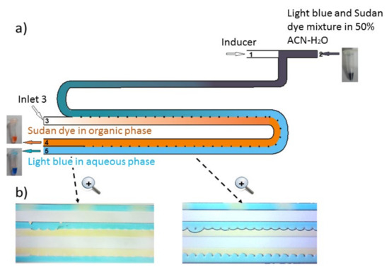 Figure 1a shows schematically how a dye mixture behaves in the IPSE chip. The color of the dye mixture prior to infusion is dark blue, while after separation in the IPSE chip, the organic phase from Outlet 4 is orange (non-polar Sudan dye) and the aqueous phase from Outlet 5 is clear blue (polar Indigo blue dye). In the upper channel of 4 cm length in Figure 1b, the plug flow can be clearly observed while in the lower parallel channels of 6.4 cm length, laminar flows are present. The left photo in Figure 1a zooms in on the outlet part, showing well-separated orange and blue phases each eluting from their own outlet, i.e., proof of principle of a working design was obtained. Next several parameters influencing the IPSE process, including flow rates and inducer-solvent composition, were systematically investigated for their effect on phase separation and extraction efficiency.
