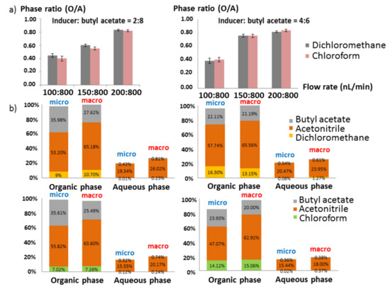 (a) Phase ratio as a function of inducer flow rates (0.10, 0.15 and 0.20 µL/min), nature of inducer (dichloromethane or chloroform) and volume ratio of inducer and butyl acetate (2:8 or 4:6); (b) relative volume percentages of collected organic and aqueous phases at microscale (IPSE chip) and macroscale (Eppendorf tube) for both dichloromethane (upper) and chloroform (bottom) used at the optimal flow conditions. Volume ratio of inducer and butyl acetate is 2:8 (left) and 4:6 (right).