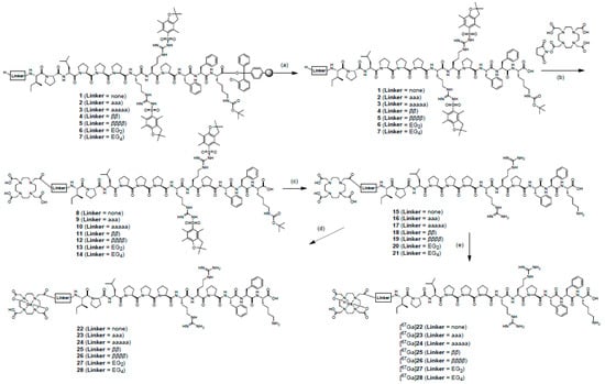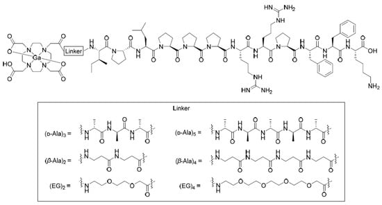 However, for some peptides in the DOTA chelation system, which is placed too close to the pharmacophore, the binding affinity may be decreased between peptides and target molecules. In this case, an appropriate spacer insertion between DOTA and the pharmacophore could improve the binding affinity [25,26,27]. Introduction of linkers can affect both the in vitro and in vivo properties of the peptide toward its molecular target and the corresponding pharmacokinetics [28]. It has been reported that hydrocarbon, un-natural amino acid, and ethylene glycol linkers display profound favorable effects in the receptor binding affinities and/or pharmacokinetics of radiolabeled peptides, such as bombesin, RGD, and α-MSH peptides [29,30,31,32].
