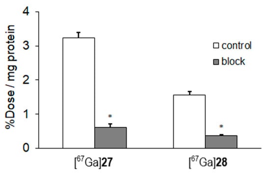 Uptake of [67Ga]27 and [67Ga]28 into BxPC3-luc cells at 1 h with or without IPLPPPRRPFFK as a blocking agent. Data were presented as mean ± SD for three samples. Significance was determined using unpaired Student’s t-test (* p < 0.05, vs. control).