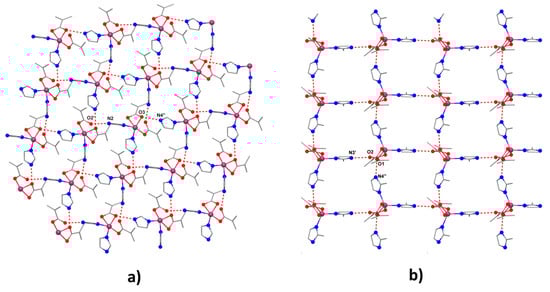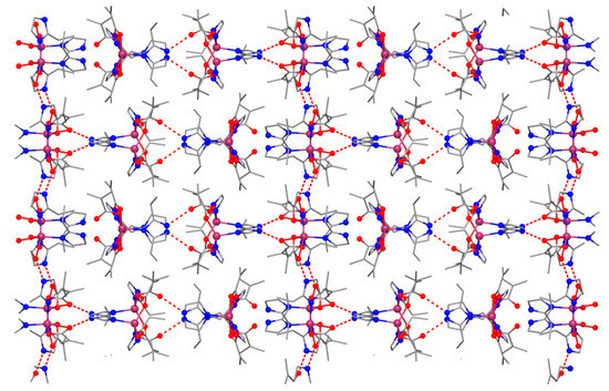 Selected bond distances and angles for the two compounds are collected in Table 2 and Table S2. The mononuclear entities interact through hydrogen bonds established between the nitrogen atoms of one ligand groups and the oxygen atoms belonging to a neighboring unit resulting in a supramolecular square grid topology (Figure 2) [O2′-N2= 2.687 Å, O3-N4′′= 2.762 Å, ′ = 0.5 + x, −0.5 − y, z, ′′ = −0.5 + x, 0.5 − y, z for (1) and O2-N3′ = 2.723 Å, O1-N4′′ = 2.762 Å, ′ = x, 1.5 − y, 0.5 + z, ′′ = x, −1 + y, z for (2)].