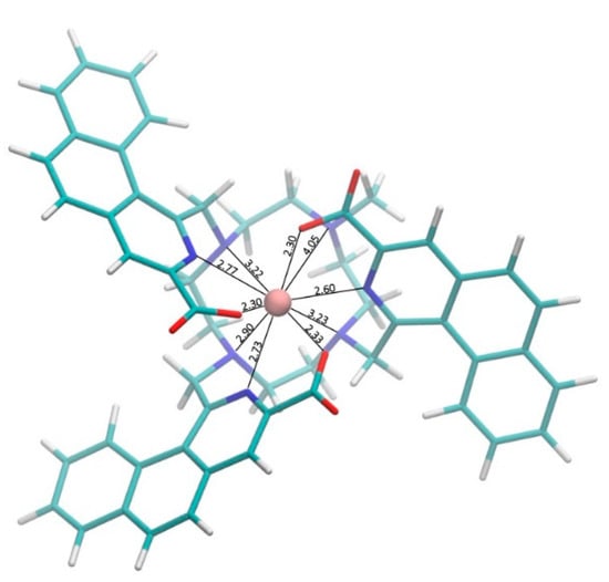 3D geometry from DFT optimization. The relevant distances of the ligand to Eu3+ are reported in Å. The picture was produced using VMD [].