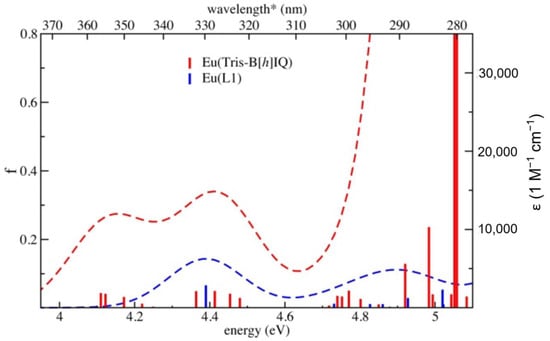 Figure 2 reports the excitations predicted by time-dependent DFT for the two complexes. The employed CAM-B3LYP exchange and correlation potential is known to generally overestimate excitation energies []. However, if we focus on energy shifts between molecules in the same class, the prediction is more accurate. In this regard, we predicted a 0.27 eV red-shift for the lowest-energy band of [Eu(Tris-B[h]IQ)] compared to EuL1 []. Since the experimental excitation peak of EuL1 is at 330 nm (3.76 eV), this red-shift would correspond to experimental wavelengths of 355 nm. Thus, the extension of the aromatic π-system from isoquinoline to benzoisoquinoline was expected to effectively red-shift the ligand absorption without falling into the region where metal sensitization crumbles owing to energy back-transfer [] This prediction was also supported by the reported experimental phosphorescence spectrum of benzoisoquinoline in water at 77 K, which shows major bands at 21,650 and 21,370 cm−1, i.e., in the region of highest sensitization of Eu3+ by triplet states [].