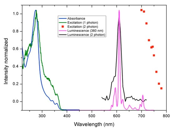 Absorption, excitation and one/two photon emission spectra of Na[Eu(Tris-B[h]IQ)] complex at pH = 7.4.