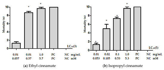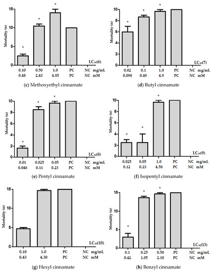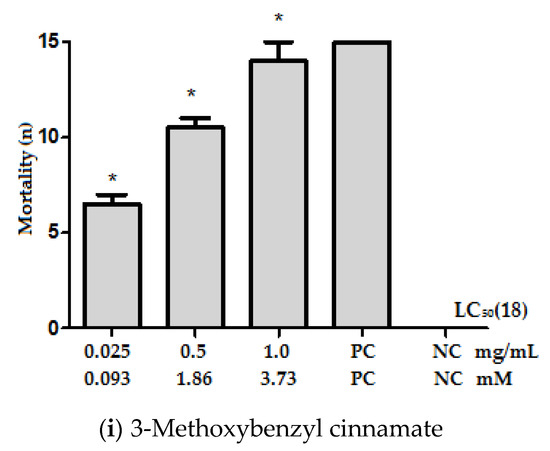 The best larvicidal activity among different cinnamic acid derivative concentrations: (a) ethyl cinnamate, (b) isopropyl cinnamate, (c) methoxyethyl cinnamate, (d) butyl cinnamate, (e) pentyl cinnamate, (f) isopentyl cinnamate, (g) hexyl cinnamate, (h) benzyl cinnamate and (i) 3-metoxybenzyl cinnamate against Ae. aegypti larvae after 24 h (expressed in mg/mL and convert mM). PC = positive control, NC = negative control. (*) Indicates results that are significantly different from the controls.