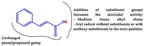 Thus, the SAR analysis shows certain structural features do increase larvicidal activity, such as cinnamate alkyl side chain, (especially the median linear carbon chain); or aryl radicals without substituents; or aryl radicals with meta position methoxy substituents. Figure 2 summarizes the study of cinnamic acid derivatives for larvicidal activity. The results are encouraging, and they show that esters of cinnamic acid are structurally simpler than the insecticide temephos, exhibit larvicidal potential, and are either found in nature or analogous to natural cinnamic derivatives.