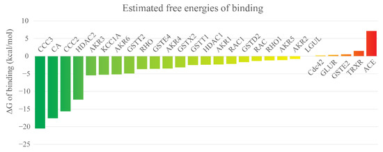 Compound 8 is predicted to have very low affinity for a group of proteins that includes LGUL, AKR2, AKR5, RHO1, RAC, GSTD2, RAC1. AKR1, HDAC1 and GSTT1 with predicted ΔG of binding ranging from −0.07 to −2.51 kcal/mol. A third set of targets formed by GSTX2, AKR4, GSTE4, RHO, GSTT2, AKR6, KCC1A and AKR3 is predicted with low to moderate ΔGs of binding. Interestingly, this set is enriched with proteins annotated with aldo-keto reductase and glutathione transferase functions, both involved in maintaining the redox equilibrium in the cell. Finally, the best values of predicted ΔG of binding are obtained for the HDAC2, CCC2, CA and CCC3 targets.