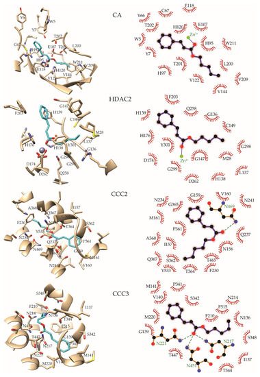 Overall, the obtained free energies of binding point to HDAC2, CCC2, CA and CCC3 as the most probable targets of the cinnamic acid derivatives herein studied. To get more insights into the possible mechanism of action of these compounds, the predicted complexes of compound 8 with them were analyzed in detail. In Figure 4 are represented the predicted binding modes of compound 8 to HDAC2, CCC2, CA and CCC3 as well as the diagrams of observed ligand-receptor interactions along the 200 MD snapshots used in MM-PBSA calculations. The binding poses represented in Figure 4 correspond to the centroids of the most populated clusters derived from the clustering of the 200 MD snapshots used for MM-PBSA calculations. All analyses presented below base on the interactions observed in at least 50% of the extracted MD snapshots.