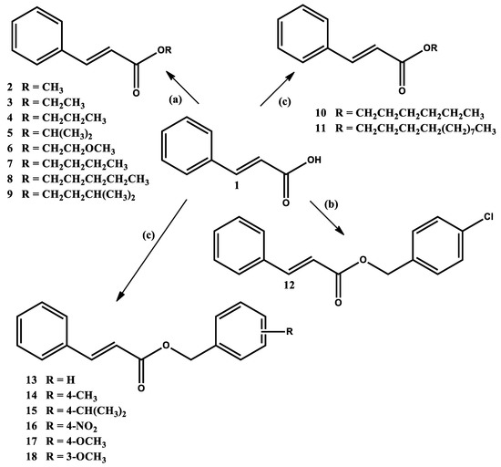 To a 100 mL flask, cinnamic acid (0.25 g, 1.69 mmol) and alcohol (50 mL) were added in the presence of sulfuric acid (0.4 mL), and were heated under reflux until completion of the reaction (5–24 h), being verified by single spot TLC. The alcohol was then removed under reduced pressure until about half and the solution was diluted with 20 mL of water. The product was extracted using ethyl acetate (3 × 15 mL), and the organic phase was neutralized successively with 5% sodium bicarbonate, washed with water, then dried over anhydrous sodium sulfate, and filtered. After evaporation under reduced pressure, certain compounds required a column for purification, this phase yielded the ester derivatives, shown in Scheme 1 [41].