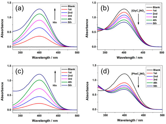 The pKa value is a quantitative parameter to insure the strength of the Brønsted acids. The lower pKa values means the stronger acidity of the PILs. The UV/Vis spectral absorbance of the indicator (sodium 4-nitrophenolate) after every titration in water is illustrated in Figure 1. (The other UV-Vis spectra of the titration of [AAE]X is illustrated in Figures S1–S18). Figure 1a,c respectively represent the absorption spectra of the indicator after adding a quantitative indicator to the alkali liquor (sodium hydroxide). Figure 1b,d respectively represent the absorption spectra of the indicator after adding the quantitative [AAE]X of [GlyC1]NO3 and [PheC1]NO3. The absorption intensity at the maximum absorption wavelength of the 4-nitrophenolate anion continually decreased after quantificationally adding [AAE]X in the solvents. The pKa values were obtained by the change of the absorption intensity at the maximum absorption wavelength. The pKa values of [AAE]X and the contrastive compounds in water by OIM according to Equation (2) are listed in Table 1.