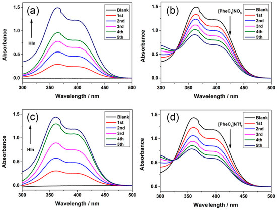 Absorption spectra of the 2,4-dinitrophenolate ion for various adding amounts of the indicator or [AAE]X during the titration in ethanol. (a) Adding the indicator before the titration of [PheC1]NO3. (b) Adding [PheC1]NO3 during the titration. (c) Adding the indicator before the titration of [PheC1]NTf2. (d) Adding [PheC1]NTf2 during the titration.