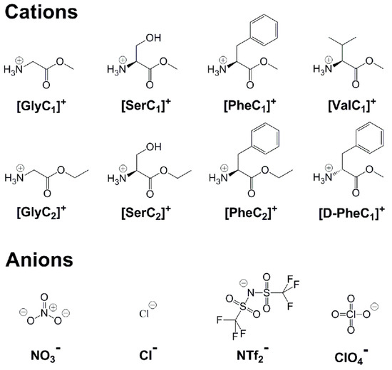 To systematically explore the acidity of [AAE]X, eight [AAE]+ and four anions (including nitrate (NO3−), chloride (Cl−), perchlorate (ClO4−) and trifluoromethanesulfonate (NTf2−)) were studied from the viewpoint of the structure–property relationship. The cations and anions of [AAE]X used in this work are shown in Figure 3. All [AAE]X PILs were synthesized and characterized by the referenced method [15]. Being convenient for studying the structure–property relationship, the glycine methyl ester cation ([GlyC1]+) was chosen as the fundamental [AAE]+ framework. Other cations, including the glycine ethyl ester cation ([GlyC2]+), serine methyl ester cation ([SerC1]+), serine ethyl ester cation ([SerC2]+), phenylalanine methyl ester cation ([PheC1]+), phenylalanine ethyl ester cation ([PheC2]+), valine methyl ester cation ([ValC1]+) and D-phenylalanine methyl ester cation ([D-PheC1]+), could be viewed as the derivatives of [GlyC1]+.