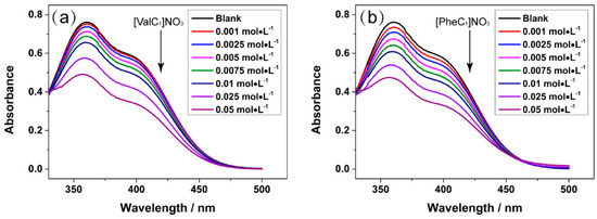The relationship between the acidity and concentration is important for many applications, such as catalysis [9,37,51]. The H0 of [ValC1]NO3 and [PheC1]NO3 in aqueous solutions at various concentrations were measured. In the UV/Vis spectra, a noticeable decrease of the maximum absorption peak was found, accompanied with adding [ValC1]NO3 and [PheC1]NO3 (Figure 4). The H0 reduced when the concentration increased. The relationship between the concentration of [ValC1]NO3 and [PheC1]NO3 and the H0 can be obtained using the fitting equations. Their fitting equations are: