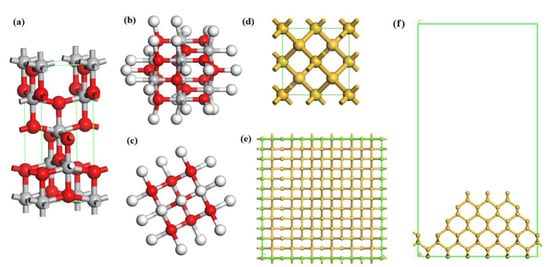 The calculated band gap of the TiO2 unit cell was 2.282 eV, which was smaller than the experimental value of 3.2 eV. However, since the band gap calculated by the GGA method is always less than the actual value, it is feasible to use the calculated data for comparison. The lattice constants of the anatase titanium dioxide model were a = b = 3.776 Å, c = 9.486 Å. The structure of anatase titanium dioxide was optimized, and the optimized Ti-O bond lengths were 1.930 Å and 1.973 Å, which were very similar to the experimental data 1.934 Å and 1.980 Å. The dangling bonds of the TiO2 cluster were saturated with H. The calculated band gap of the Si unit cell was 1.099 eV, which was smaller than the experimental data (about 1.2 eV). Considering the actual profile of the workpiece surface, an irregular convex Si (100) surface with periodic boundary conditions was set up as shown in Figure 2e,f. The Si surface was cut out from a Si 4 × 4 × 3 supercell. The lattice parameters of the silicon supercell were as follows: a = b = 23.04 Å, c = 44.93 Å, and the vacuum layer thickness was 30.0 Å. All the above models were optimized before calculation.