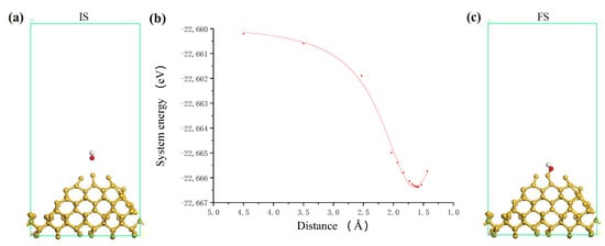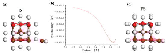 The process of OH group adsorbing on TiO2 cluster. (a) Initial state (IS); (b) system energy; (c) final state (FS) where white, red and grey balls are hydrogen, oxygen and titanium atoms, respectively.