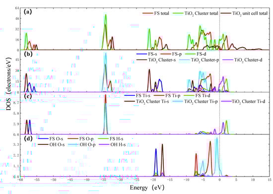 The density of states (DOS) of OH group adsorbing on the surface of TiO2 cluster. (a) Total DOS of FS, TiO2 cluster and TiO2 unit cell; (b) Partial density of states (PDOS) of FS and TiO2 cluster; (c) PDOS of adsorption site Ti atoms of FS and TiO2 cluster; (d) PDOS of O atom and H atom of FS and OH group.