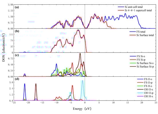 The DOS of OH group adsorbing on the Si surface. (a) Total DOS of Si unit cell and 4 × 4 × 1 supercell; (b) total DOS of FS and Si surface; (c) PDOS of adsorption site Si atoms of FS and Si surface; (d) PDOS of O atom and H atom of FS and OH group.