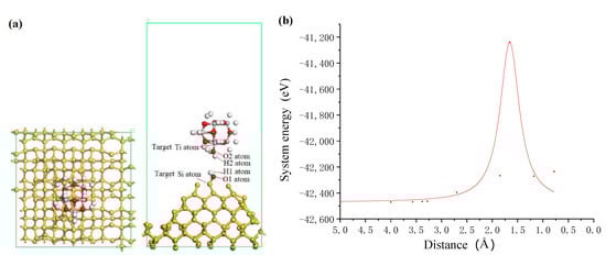 A large number of hydroxyl (OH) groups can be produced in the TiO2 colloid under the action of photocatalysis of ultraviolet light [22]. These OH groups can interact with the unsaturated atoms on the surface of the nanoparticles and the workpiece to achieve surface adsorption and generate surface hydroxyl groups. Figure 3 shows the adsorption process of OH group on a suspended unsaturated Ti atom of TiO2 cluster. Figure 3b shows the relationship between the total system energy and the distance in the adsorption process. According to the intensity of the curve variation, it is considered that the interaction between OH group and TiO2 cluster changes from a weak interaction to a strong interaction when the distance is about 3.0 Å, and the interaction becomes repulsive when the distance is about 1.8 Å. Therefore, it can be considered that the OH is adsorbed onto the TiO2 cluster and bonded at this point. In the colloid, the process of OH group adsorbing on the TiO2 nanoparticle is an exothermic process with the adsorption energy of about 1.87 eV. After bonding, the structure of the system was optimized, and the final structure of the adsorption system was obtained, as shown in Figure 3c. The OH group in the colloid finally adsorbs on the target Ti atom with O atom end inward, and becomes the surface adsorbed hydroxyl group with Ti-O bond 1.794 Å.