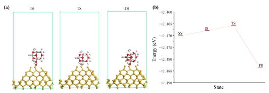 According to the results of Figure 8b, taking the energy of the separated state (SS) as the reference value, the adsorption energies of initial state (IS) and FS are −2.199 eV and 13.568 eV, respectively. The adsorption energy of the saddle point (TS) on the potential energy surface between the two states is −4.360 eV. From the IS state, the activation energy of the reaction is −2.161 eV, which is an endothermic reaction. In the process of ultraviolet induced nanoparticle colloid jet machining the kinetic energy of high speed incident nanoparticles can provide energy for the endothermic reaction to make the reaction proceed smoothly.