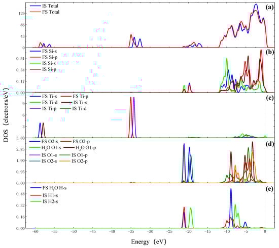 The DOS of TiO2 cluster adsorbing on the Si surface. (a) Total DOS of FS and IS; (b) PDOS of target Si atoms of FS and IS; (c) PDOS of target Ti atoms of FS and IS; (d) PDOS of O1 and O2 atoms of FS and H2O molecule and IS; (e) PDOS of H1 and H2 atoms of FS and H2O molecule and IS.