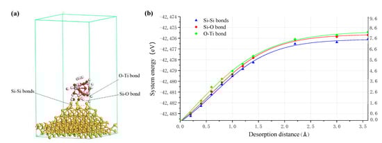 Figure 10b shows the relationship between the system energy and the bond length of the above three kinds of chemical bonds when the chemically adsorbed TiO2 cluster is separated from the Si surface. According to the results, when the separating distance is about 1.4 Å, the energy curves of the system become smooth. It can be considered that at this point, each target bond begins to be broken and the TiO2 cluster is separated from the Si surface. The calculation results showed that the order of energy needed to break the above three bonds is that: ETi-O bond > EO-Si bond > E2 Si-Si bonds. In the process of the TiO2 cluster being separated from the silicon surface, the two Si-Si back bonds will be broken preferentially in the separation process. When the two Si-Si back bonds are broken, the target Si atom of the silicon surface is removed together with the TiO2 cluster, thus realizing the atomic level removal of the workpiece material.