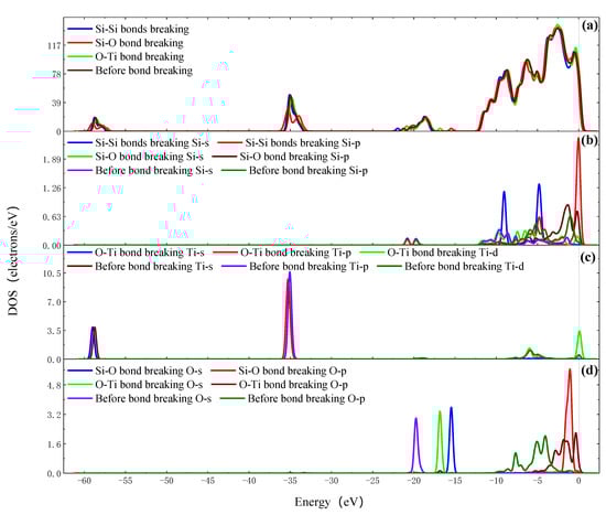 The DOS of TiO2 cluster separating from the Si surface. (a) Total DOS; (b) PDOS of adsorption site Si atoms; (c) PDOS of adsorption site Ti atoms; (d) PDOS of adsorption site O atoms.