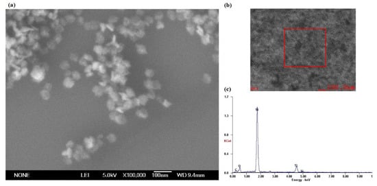 The morphology and microanalysis of TiO2 nanoparticles adsorbing on Si surface. (a) The morphology; (b) the microanalysis areas and (c) the microanalysis results.