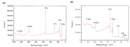 Full spectrum of (a) XPS of the original Si surface; (b) XPS of Si surface after TiO2 nanoparticle colloid jet impacting under ultraviolet irradiation.
